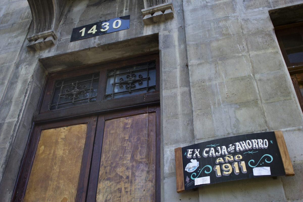 Croquis dibujado a mano alzada de la fachada de la Caja de Ahorros en colores blanco, negro y gris.